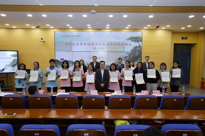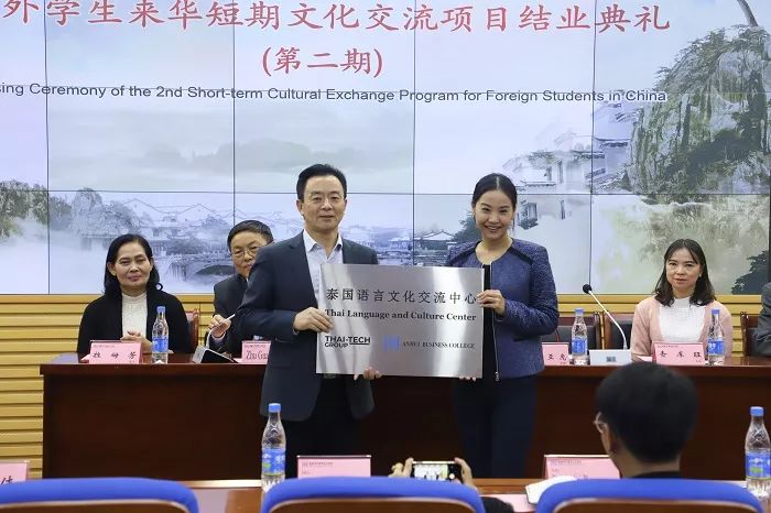 结业典礼上,双方举行了“泰国语言文化中心”揭牌仪式,校领导和校相关部门领导老师向泰方学生颁发结业证书。