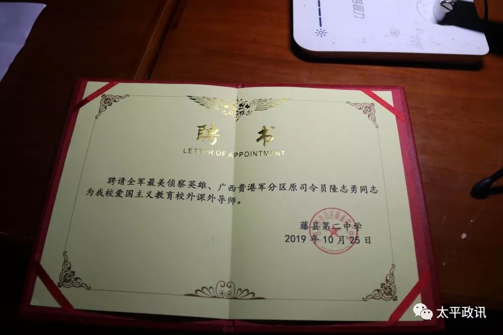 战斗事迹宣讲结束后,藤县第二中学校长李焕向隆志勇同志颁发了聘请书,正式聘请全军侦察英雄、广西贵港军分区原司令员隆志勇为该校爱国主义教育校外课外导师。