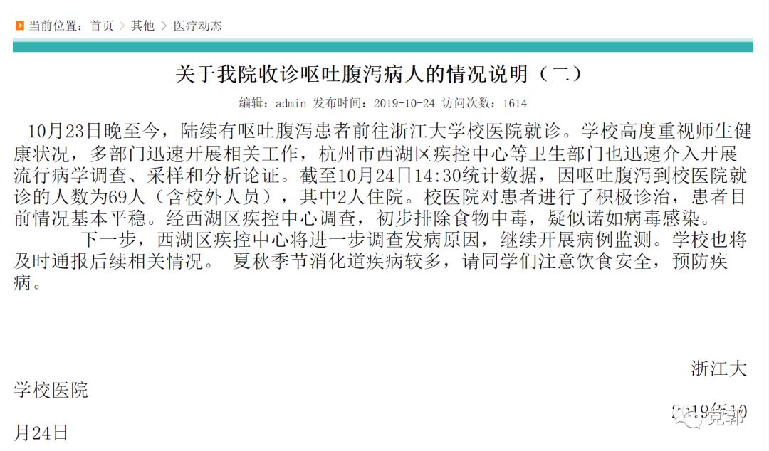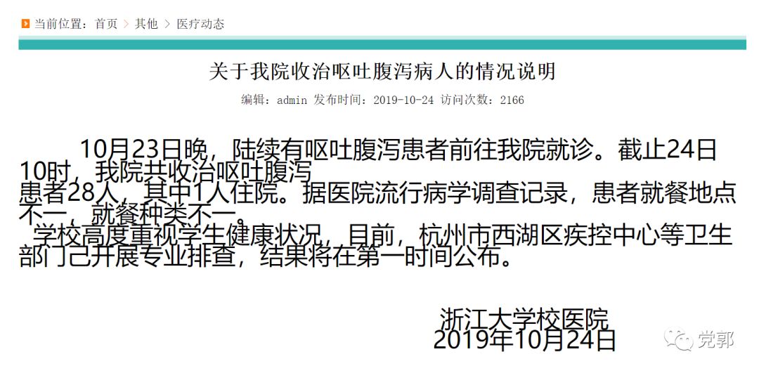 10月24日,浙大校医院发布情况说明:截至24日10时,28位同学腹泻呕吐,其中1人住院。同学迅即对校方数据产生了质疑,因为卫生部《食物中毒事故处理办法》第7条规定,中毒人数超过30人的,当于6小时内报告同级人民政府和上级人民政府卫生行政部门。校方公布的数据恰好控制在了30人以下。