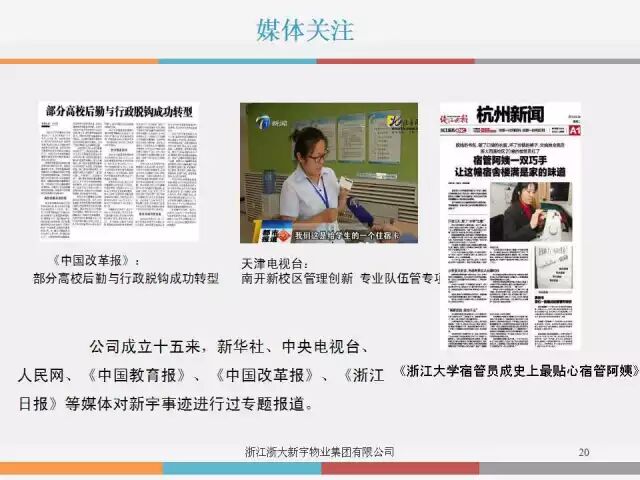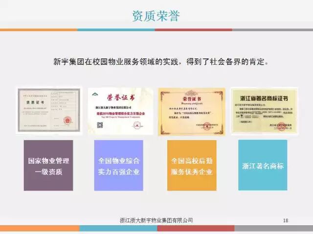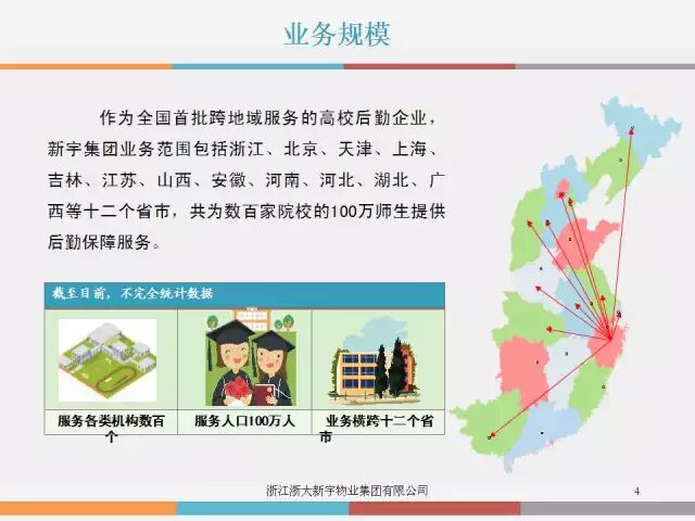 浙江大学新宇集团是浙江大学所属的一家业务涵盖校园后勤综合服务、房地产、酒店等多行业、跨地区的现代高校后勤企业集团,是全国高校知名的“中国校园后勤综合服务提供商”,“中国物业管理综合实力百强企业”,“中国校园物业服务百强企业”前三甲,“中国高校后勤服务优秀企业”。现有下属子(分)公司20余家,拥有8000多名从业人员,其中管理人员75%以上具有本科及以上学历,服务上百所大中院校及企事业单位,服务人数100万人,服务面积达1000万平方米。浙江大学新宇集团已发展成为一个人才荟萃、资金雄厚、管理经验丰富、市场运作良好的具有一定规模的集团化企业。