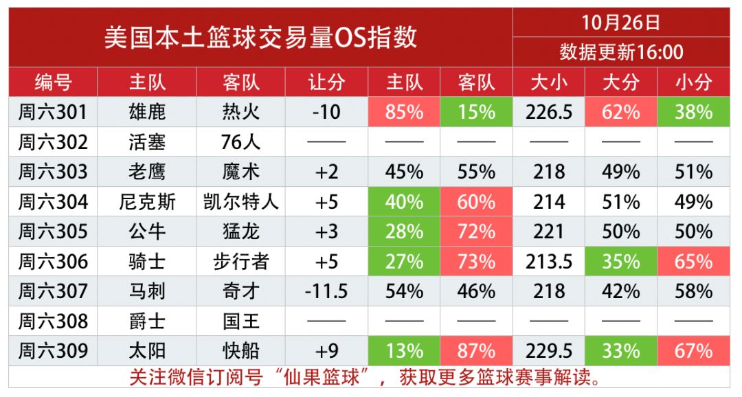 仙果篮球推出全新的美国本土交易量指数包月服务,单日价格58元,包月享受会员价1688元。美国本土篮球交易量指数,包括CC指数和OS指数,每天早上07:00更新,用最新的交易量变化玩转NBA,可以识别上图中的二维码进行订阅。
