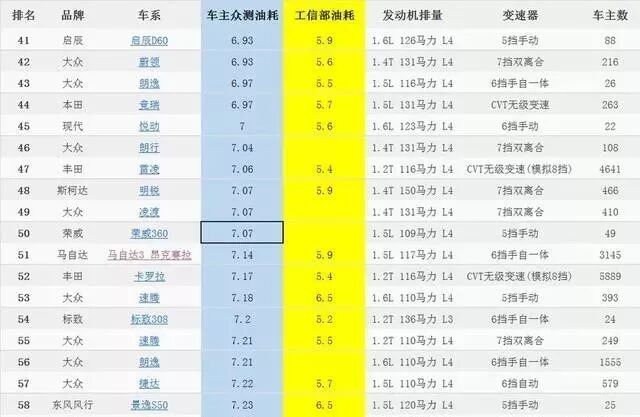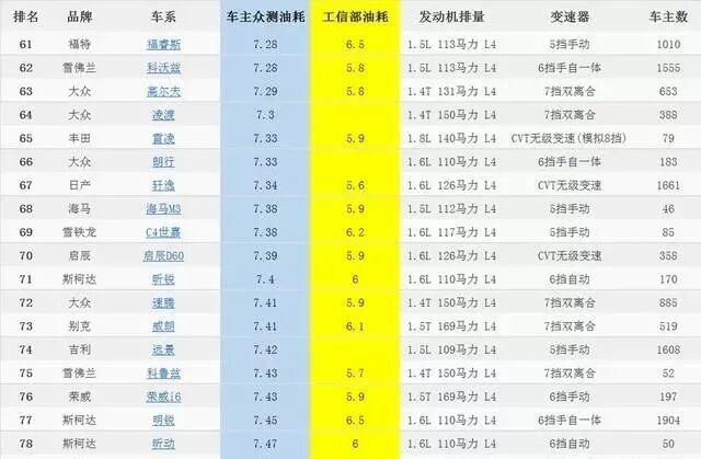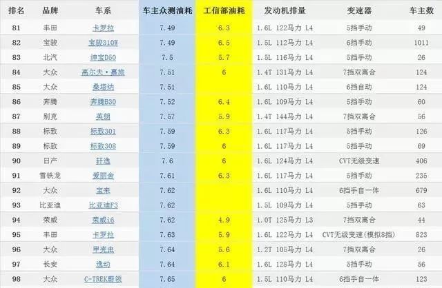 日产轩逸仅排名第23位,它的1.6L手动车车型油耗达到了6.65L,这对于比较注重有好的日系车来说,算是比较普通的了。位居第27位的是丰田卡罗拉,它的最小排量的车型1.2T手动挡,油耗为6.73L。大众速腾位居第31位,福特福克斯位居第32位,百公里油耗为6.76L。41-100排名如下: