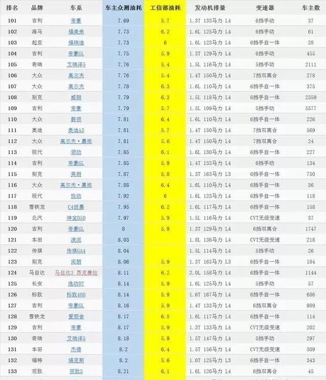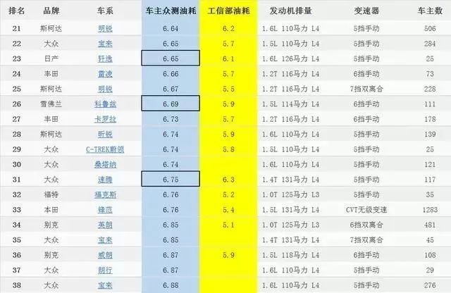 现在国内最常见的车型就是A级车型(紧凑型),主要是因为这个车型各个方面都比较符合我们家庭使用。如今油价越来越高,大家在购车的时候,油耗问题就不得不考虑了。选择一台比较省油的车,开起来既省钱又舒心,但是现在市面的油耗全都不是准的,为什么这么说呢?很多人会问,工信部油耗也不准么?人家起码是官方的数据啊。工信部油耗一般都是一个理论值,能达到这个值的人几乎是没有的,所以工信部油耗也叫“理论油耗”。很多人又会问,就算工信部油耗不准,那不是还有车载中控台的表显油耗?这个数据开过车的老司机都知道,其实它就是厂家给出的“广告油耗”。近日,国内某汽车综合平台对5万多位实名认证的车主进行了油耗问卷调查,然后根据全国各地的车主反馈回来的数据,进行筛选、去杂、分析之后,得出了国内所有A级车型的真实油耗排名(参与排名的车型样本数必须大于30位),大家一起来看一下,在以后的购车当中也可以有个参考。国内A级车油耗排名1-10位: