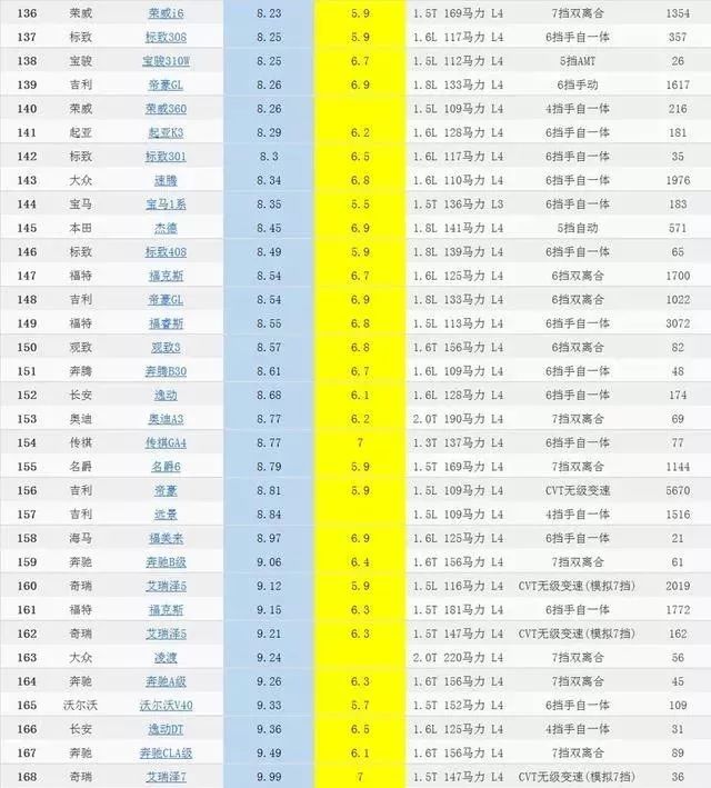 荣威360位居第50位,吉利远景位居第74位,其它的国产品牌也相继出现,但是国产汽车的油耗整体要比合资品牌的偏高一些。剩下的101-171排名如下: