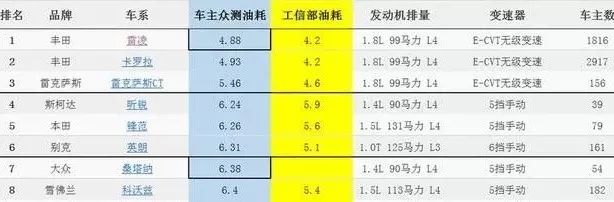 从表中可以看出,前3位全是丰田系的车型,全是1.8L的排量,但他们的油耗都不到 6L,看来丰田的E-CVT 混动技术还是非常的先进的。斯柯达昕锐位居第4位, 它的油耗也是比较低,喜欢小排量的车型的网友,就可以参考下这款车了。本田锋范和别克英朗分居5-6位,油耗也是相当可观,只是他们的动力也是比较小。