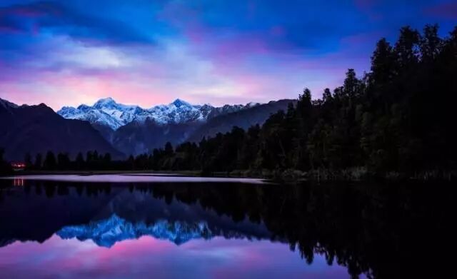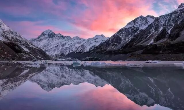 形成于1.4万年前的马瑟森湖,清晰地映出新西兰的最高峰奥拉基山(库克山)和塔斯曼山的倒影,美不胜收