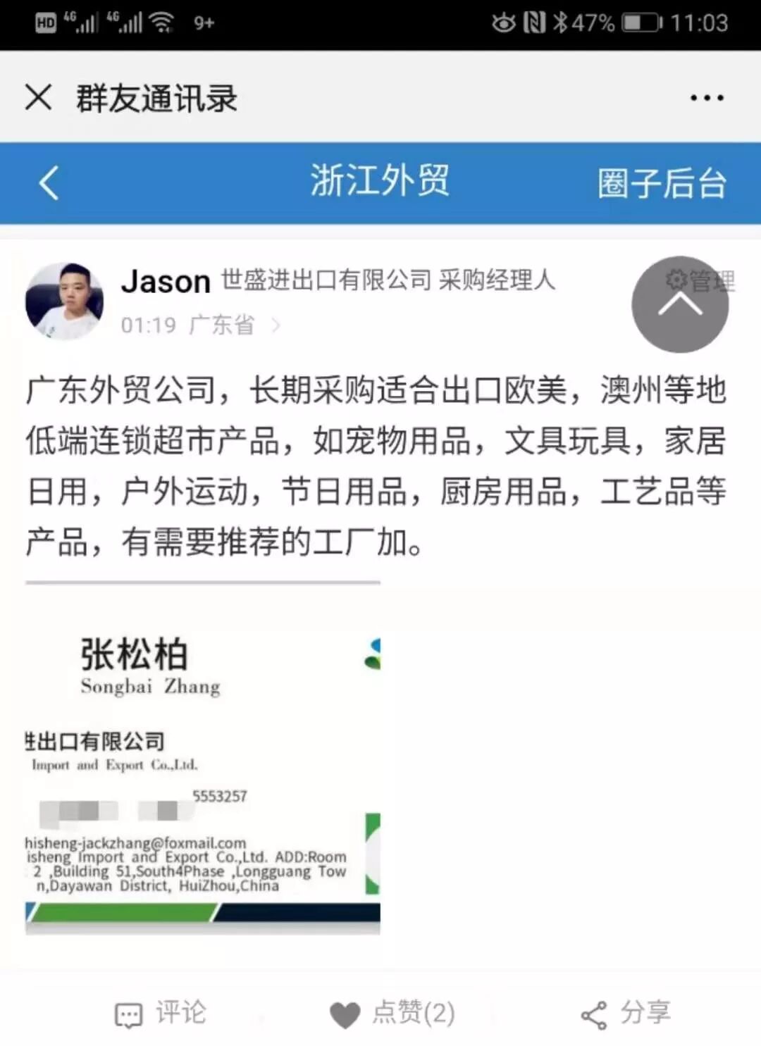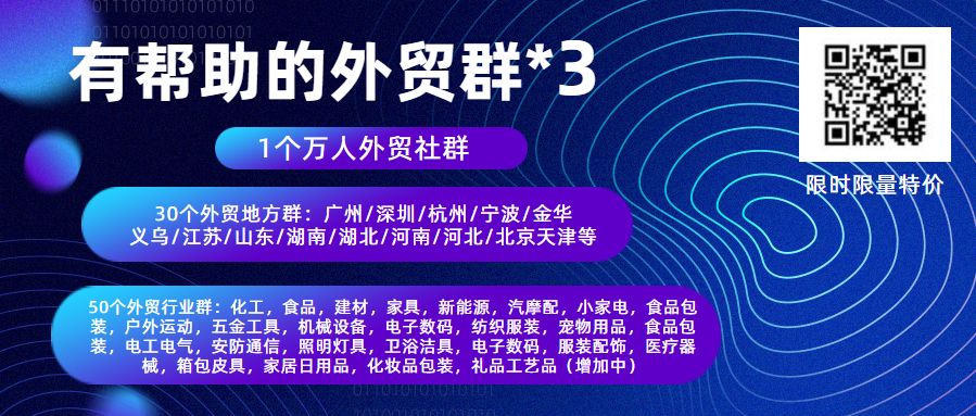 加入通讯录后,可加群主微信,拉入对应的三个微信群:1个外贸综合群+1个地方外贸群+1个行业外贸群,群里有外贸公司和采购。
