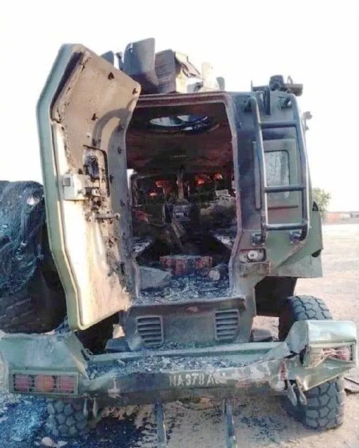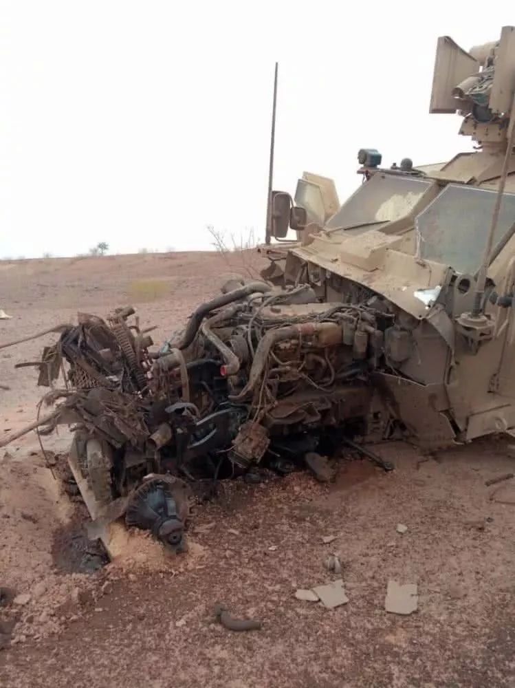 这辆尼日利亚军方的“大脚怪”防雷反伏击车也是前轮被炸毁,失去了行动能力。