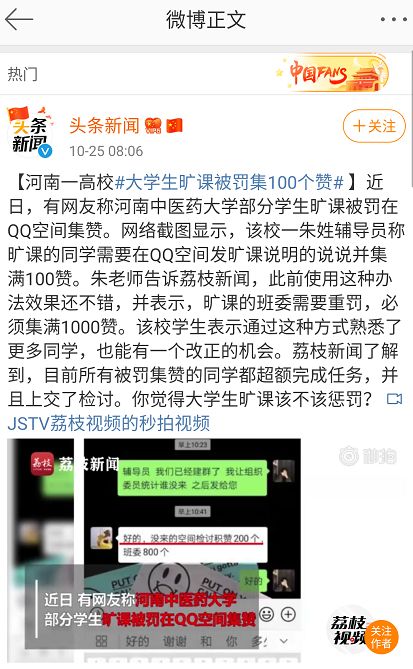 近日,微博头条新闻发布了#大学生旷课罚集赞100个#迅速引发广大网友的关注,登上了热门▼