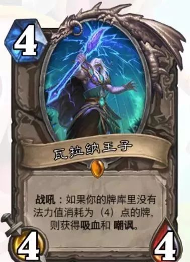 如果说三王子弱了点,四王子就更不咋地了。三费曲面没有已经很伤了,四费曲线没有根本不知道怎么玩了。而且4/4/4嘲讽吸血很强?对比下高阶祭司耶克里克,同样是嘲讽吸血,多了一点攻击而已,无伤大雅,何况祭司每弃掉一次就能加两张呢。