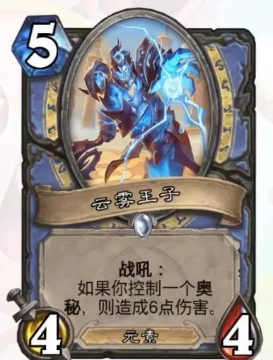 而这时,最后一位流落民间的云雾王子出现了,虽然由于流落民间,导致他连个传说等级都没混上,但在炉石里,尤其是吉安娜奥秘法手上的时候,爆发出了极强的力量,配合奥秘可以说是一费打六,效果十分爆炸。面前三位不好说,但另外两五费橙色王子绑一起,差不多被白卡王子给反杀了。战吼打马克扎尔,自己撞利亚姆,吉安娜再补一个火冲,完美。
