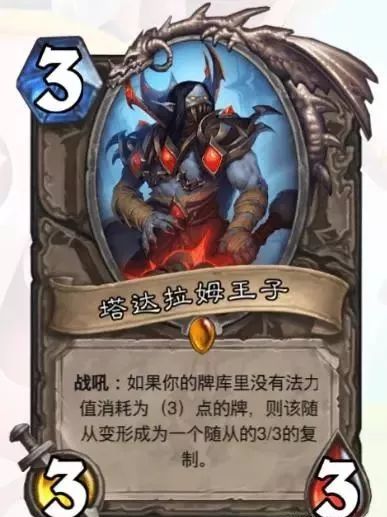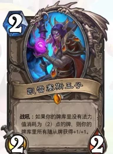 炉石里有六位王子,二三四费各一位,而五费曲线上有三位,咱咱们慢慢说。首先是二王子,作为一张我个人认为最强的王子卡,他的出现可以说给快攻卡组的构筑带来了天翻地覆的变化。取消二费曲线,然后就能给所有牌库里的随从+1+1。配合削弱前的萨隆苦囚跟双生小鬼,可以说把快攻的强度拉上去了一截。二费国王的二王子是当之无愧的。