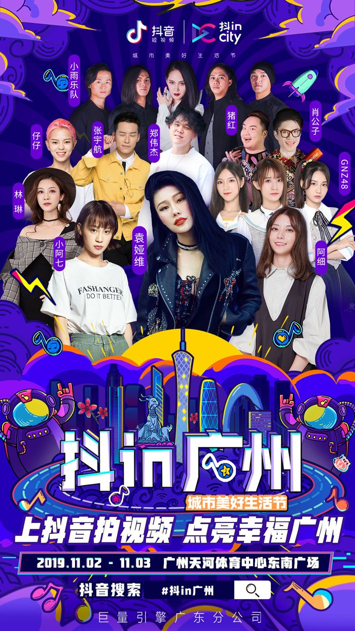 “抖in广州”之夜邀请了高音女王袁娅维领衔主场,小雨乐队、GNZ48、郑伟杰、仔仔等歌手明星,小阿七、阿细、肖公子、猪红、DJ仔仔等抖音达人亲临现场助阵,为美好广州实力打call。