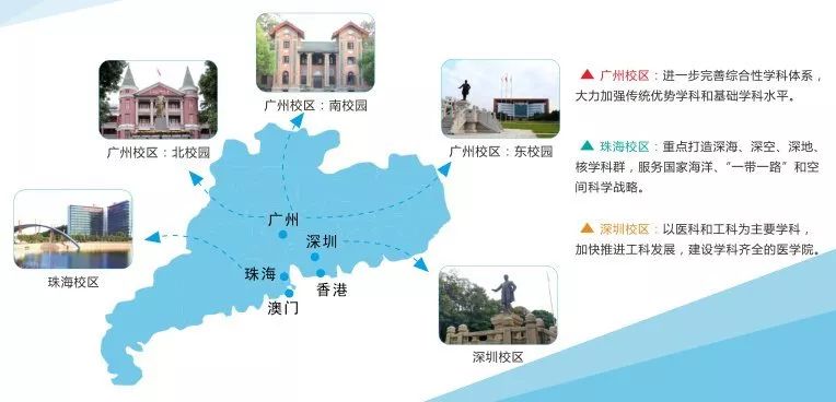 中山大学1924年由孙中山先生创建,历经90余载薪火相传,形成了优良的学风和校风,具备了人文社艺和理医工农多学科的坚实基础,学科影响力突出,已经成为一所国内一流、国际知名的现代综合性大学。现由广州校区、珠海校区、深圳校区三个校区、五个校园及十家附属医院组成。中山大学正在向世界一流大学迈进,努力成为全球学术重镇。