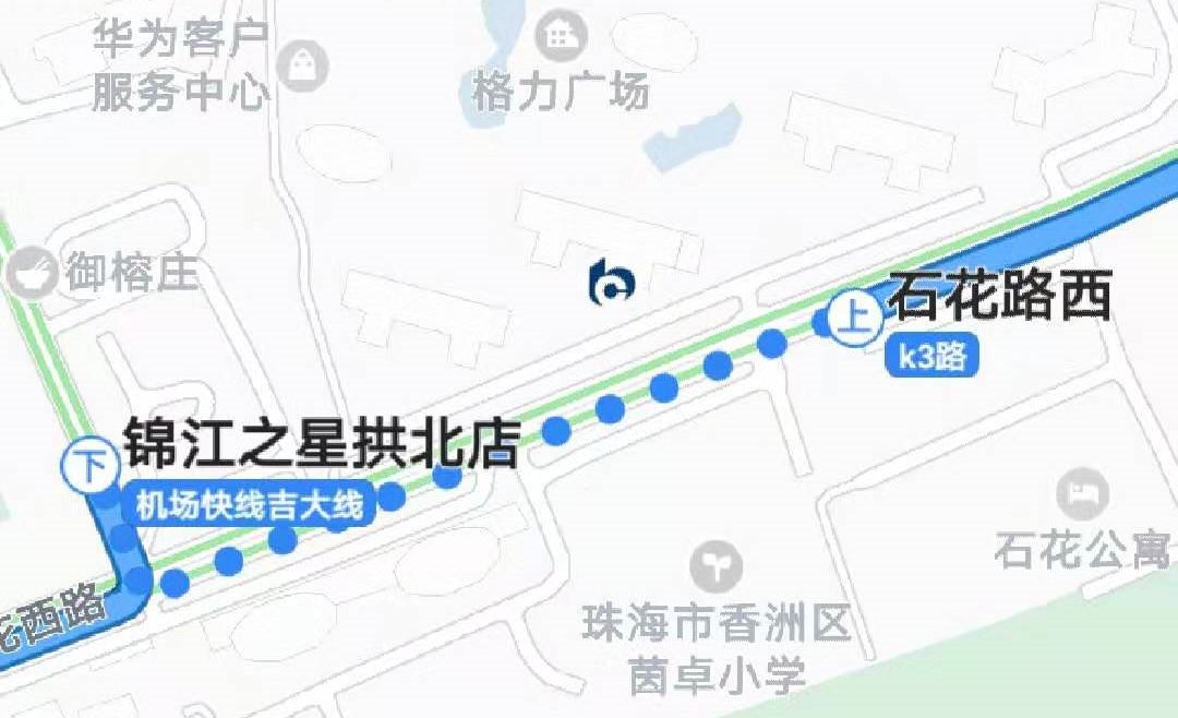 b)    步行350米至“石花西路站”(下车后向车的反方向走,并在T型路口直走过马路,左转,直走至“石花西路站”。见下图),乘坐k3路公交车(城轨唐家湾方向)至“鸡山南”下车,过马路即到达酒店;
