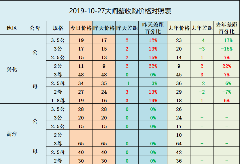 2019-10-27兴化地区大闸蟹价格对照表