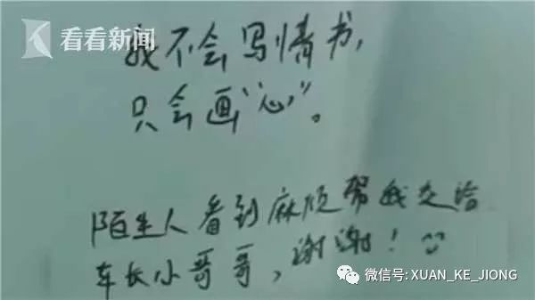 一名女孩,将一个纸袋故意“遗落”在公交车长的车座后方。车长回座后,纸袋能快吸引了他的注意。车长发现纸袋中有许多零食,其中还夹带了一张告白纸条:“我不会写情书,只会画‘心’。陌生人看到麻烦帮我交给车长小哥哥,谢谢!^_^”