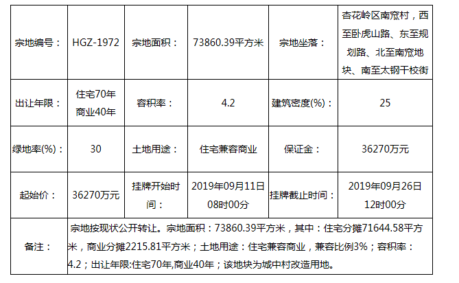 据太原市规划和自然资源局信息显示,位于杏花岭区南窊村附近的编号为HGZ-1972地块挂牌出让,宗地面积73860.39平方米,土地用途为住宅兼容商业用地,起始价36270万元。宗地具体位置位于杏花岭区南窊村,西至卧虎山路、东至规划路、北至南窊地块、南至太钢干校街。出让年限住宅70年、商业40年,容积率4.2,建筑密度25%,绿地率30%,其中住宅分摊71644.58平方米,商业分摊2215.81平方米,该地块为城中村改造用地。