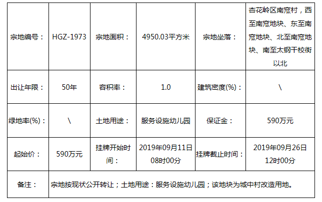 据太原市规划和自然资源局信息显示,位于杏花岭区南窊村附近的编号为HGZ-1973地块挂牌出让,宗地面积4950.03平方米,土地用途为服务设施幼儿园,起始价590万元。宗地具体位置位于杏花岭区南窊村,西至南窊地块、东至南窊地块、北至南窊地块、南至太钢干校街以北。出让年限50年,容积率1.0,该地块为城中村改造用地。