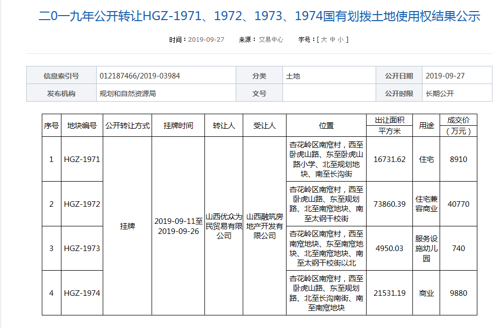 2019年9月27日,融信集团斩获杏花岭区南窊村4宗地,地块总面积为117073.23平方米,成交总价为6.0300亿元!