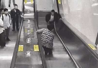 4月27日,车站地铁。地铁手扶电梯上一件大行李突然滚下,一名黑衣男子回头发现情况危急,立即转身向上冲去,将行李一把拦住,女乘客幸而避免被撞。