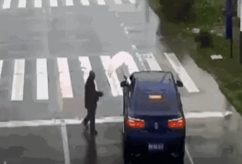 下雨天,马路边,一位老人冒雨过斑马线,过路的轿车司机见到后,摇下车窗,给老人递出了一把撑开的伞,他说,车里只有一把伞,但是老人比自己更需要。