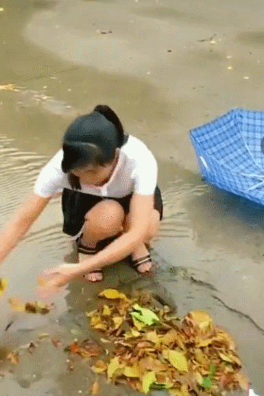 下雨天,树叶堵住了下水口一位大姐撑伞经过见到将聚集堵住的落叶清理干净下水道又恢复了水流