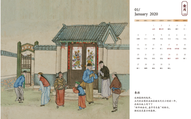 日历配图均来自《北京风俗图谱》,和当月的传统节气和风俗紧密结合。如一月则选的“春联门神”,画面中有传统的三种拜年方式:送走拜客时的拜年方式、晚辈对长的拜年方式、同辈间的拜年方式。怀古论今,十分有意义。