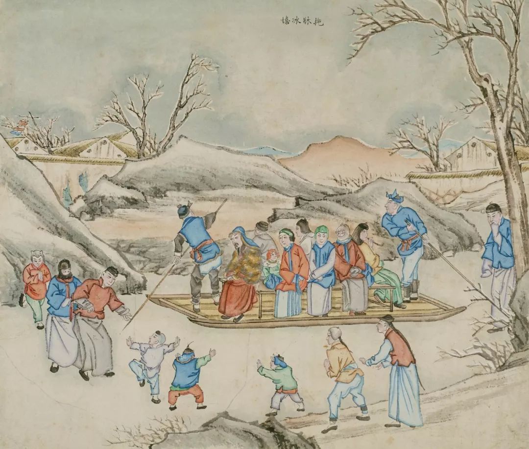 过了冬至,北京的什刹海、护城河热闹非凡,因为,冰床来了!冰床长约五尺、宽约三尺,一般为木制,床脚底部有铁条,可以坐三四个人。拉冰床的伙计一吆喝,人们就穿梭在琉璃冰雪世界,别有一番滋味。后来,滑冰开始流行,冰床就几乎销声匿迹了。
