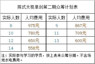 陈式单剑在拳馆是属于中级课程,通常收费3500元一人,相对较贵。而外请教练上门教学,正规拳馆要收取800~1500元一节课。我们众筹班,优惠学剑还能支持公益!