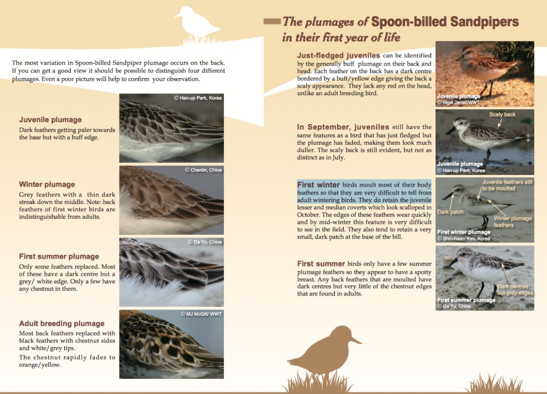 说到羽色,幼鸟、成鸟、繁殖羽不同的时期甚至不同的季节,勺嘴鹬的羽色都有较大差别,羽色又存在个体差异……我们查阅了非常多照片进行对比,勺嘴鹬保护机构Saving the Spoon-billed Sandpiper的一份研究报告给了我很大帮助。
