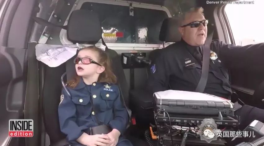Olivia换上童装款的警服,坐上警车,和“搭档”一起坐警车出击。