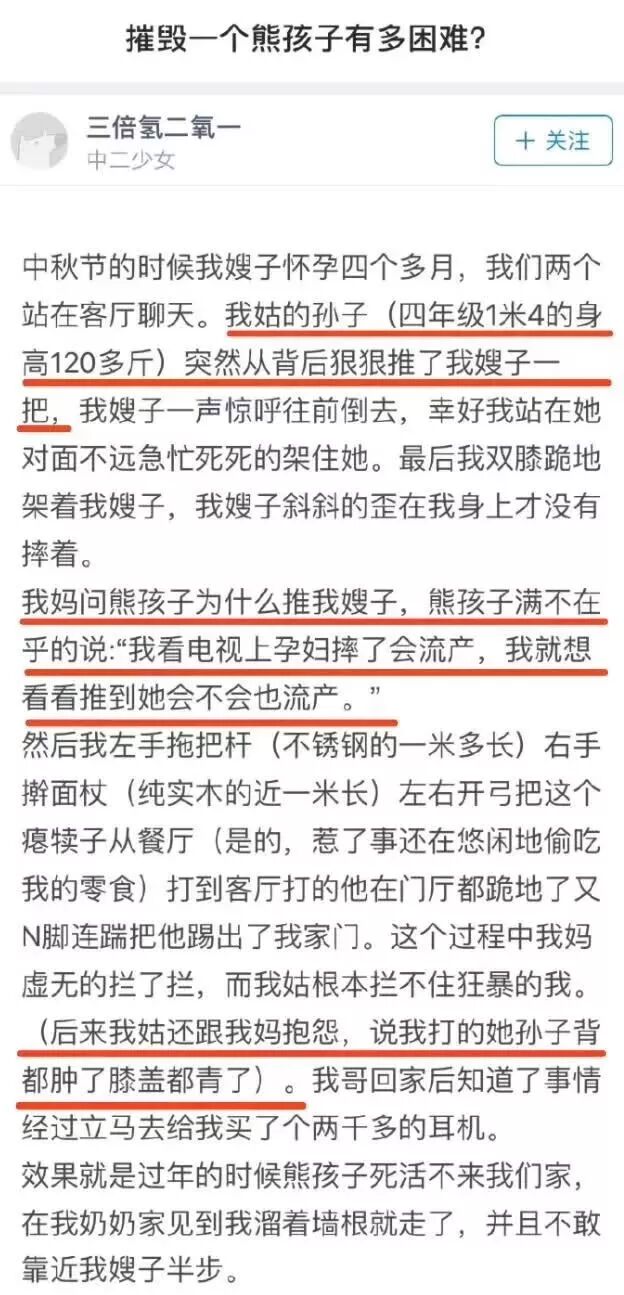 知乎曾经有个帖子:摧毁一个熊孩子有多困难? 一个身高1米4、体重120多斤的四年级的熊孩子猛推孕妇……,