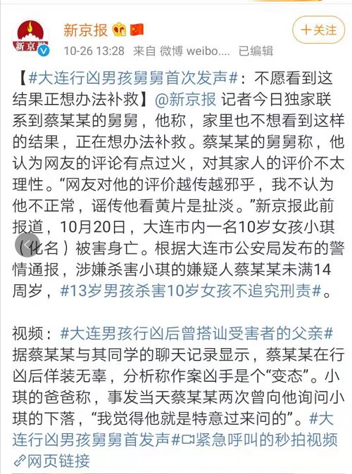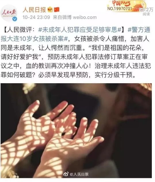 人民日报在微评中指出,“加害同是未成年人,让人愕然而沉重”,“血的教育再次冲撞人心”,“预防未成年人犯罪法草案,正在审议中”。希望这能够成为一个窗口,对这样的恶性罪犯提出解决方案,堵上这些漏洞,让一些未成年人渣明白什么可以做,什么不可以做......。