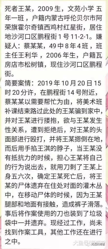 10月20日是周日,大连10岁的女孩淇淇参加完美术班补课回家,在路上她遇到了初中二年级学生蔡某某。13岁的蔡某某表示需要帮忙,将乐于助人的淇淇骗到家中。进入家门后,蔡某某对淇淇进行搂抱,并欲和琪琪发生性关系,遭到年仅10岁的淇淇拒绝。