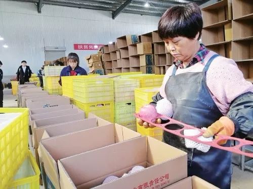 在秦安雪原果品有限责任公司的扶贫车间里,工人正在分拣包装苹果。