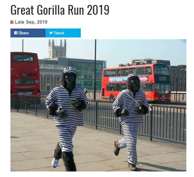 前天,英国伦敦举办了一年一度的“大猩猩跑”。参赛者要化妆成黑猩猩的样子,参与8公里的跑步比赛。这个活动的目的在于募集资金,用于保护非洲的山地大猩猩,目前世界上仅剩下1004只山地大猩猩。如今这项慈善活动成为了伦敦每年的盛事,也是英国重要的慈善活动之一。今年参加“大猩猩跑”需要交540元(人民币)的报名费,与去年相比翻了两倍。
