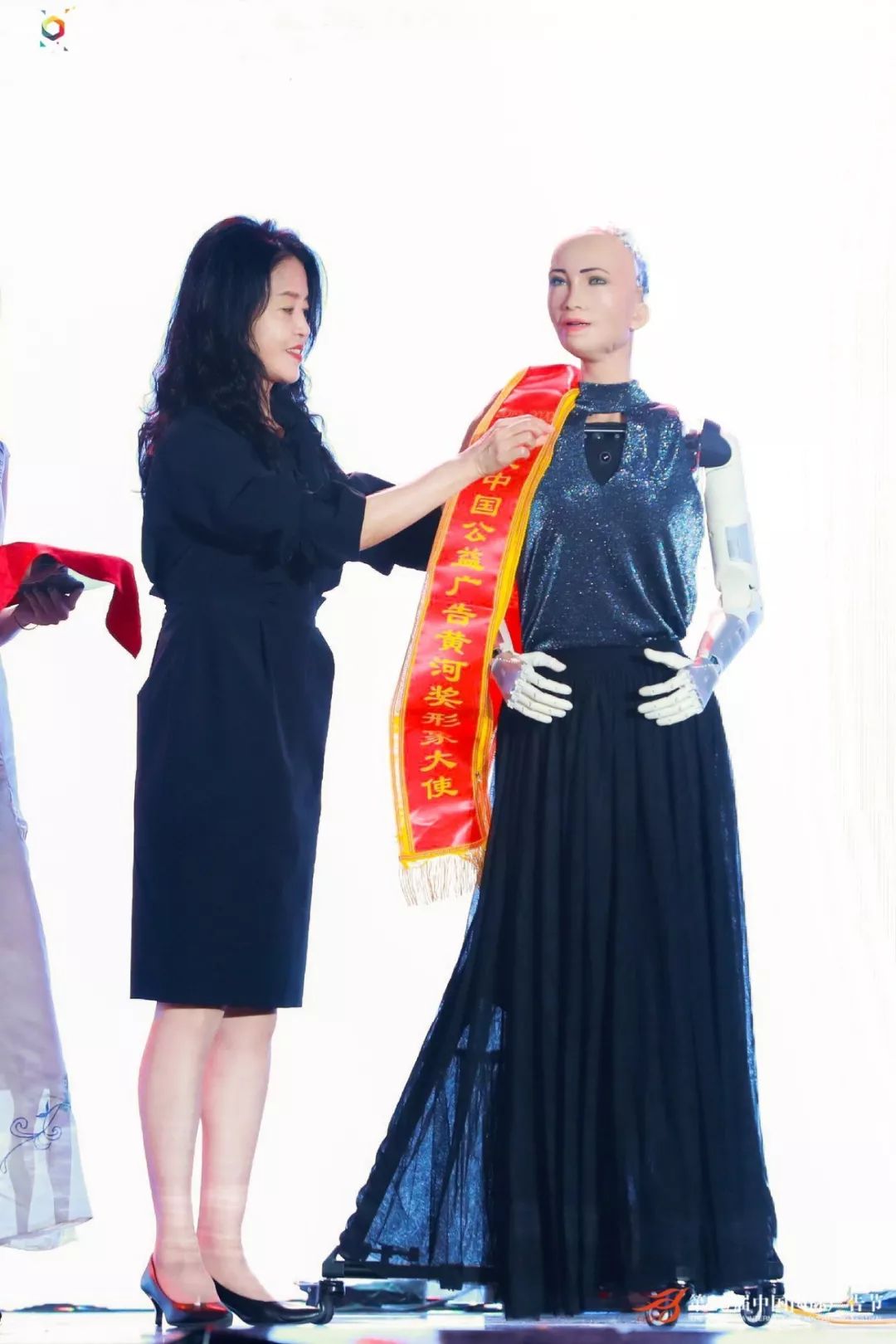 值得一提的是,神秘嘉宾——AI智能机器人索菲亚空降活动现场,引起了观众阵阵掌声。她发表了“人类与机器人共建美好社会”的感言,并与主持人进行了欢乐的即兴对话,展现AI科技魅力。随后,中广协秘书长王英偶在现场为索菲亚进行了代言人绶带。