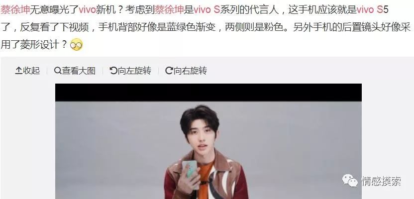 根据之前的动向,蔡徐坤代言了vivoS系列手机,以及有行业大号在微博上的猜测,应该就是S系列新机S5了。蔡徐坤手里的这个新机,颜色呈蓝绿渐变,四周氤氲着一层淡淡的粉色,具有十足的梦幻少女感,充满青春活力。
