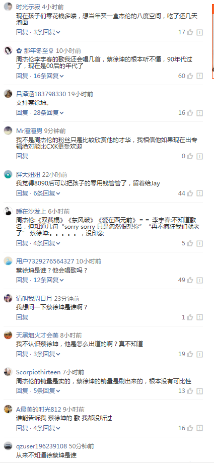 面对蔡徐坤碾压周杰伦的事情,网友的评论直接炸了!很多网友表示都没听过!