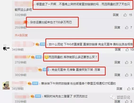 也有粉丝直接道出了真相“下午6点直接宣 直接放链接 完全无宣传 靠粉丝奔走相告”,而且说是完全没有任何宣传直接买断货,不是一天只买了3万,下架后就改为了“杂志运费加起来也才700多万而已”。