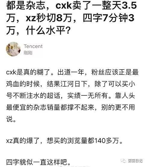 而且这个网友还说蔡徐坤出道一年,粉丝证实最鸡血的时候,结果江河日下,除了买小号不住注水超话,实绩一无所有,靠人头连最便宜的杂志销量偶读撑不起来,更别说其他的了,而肖战真的是爆了,想买的浏览量都140多万了,而易烊千玺的战绩似乎很稳定(易烊千玺算不算躺着也中枪,《长安十二时辰》表现还是很出色的)。