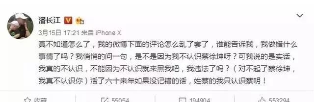 潘长江:我不知道蔡徐坤遭受了网络暴力。今天我被叫做“不要去春节联欢晚会!” 基本上是以辱骂的形式,之后潘长江也说:“我的微博评论怎么了,是因为我不知道蔡徐坤和我违法了吗?” 他还打趣道:“蔡志勇活了60多年,姓蔡明。”之后,潘长江也删除了微博。