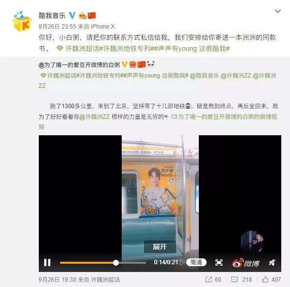 最后还有一个想说的故事,微博上有这么一个女孩儿,她从距北京一千多公里的杭州赶来,只为了在北京地铁4号线明星专列上看一眼自己的爱豆。