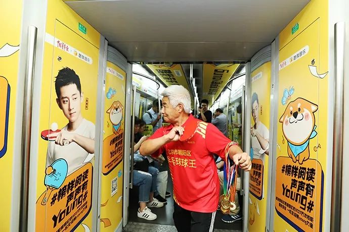 在张继科地铁专列正式运行时,有一张图片直接刷屏,图片中是一老大爷,虽是已经满头白发但精气神十足,脖子上挂着数块奖牌,手拿乒乓球叫板世界冠军张继科。