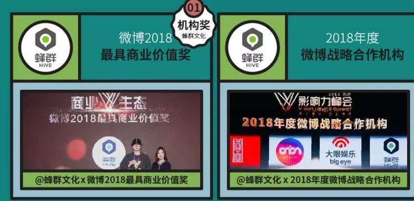 蜂群MCN并不是什么野路子公司,而是根正苗红,有官方认证背书的正牌MCN机构,甚至还是微博2018年度的战略合作机构,得到微博给颁发的“最具商业价值奖”。