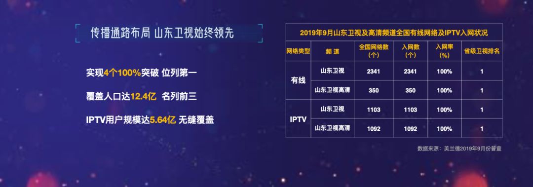 2019年,山东卫视强化全媒体渠道建设,继续巩固到达优势,在全国有线网络及IPTV入网率实现了4个100%的突破,位列第一;覆盖人口达12.4亿,稳居省级卫视前三甲;IPTV用户规模达5.64亿,无缝覆盖,保证了企业品牌到达的畅通无阻。