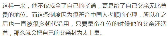 建立汉朝之后他依据秦朝的旧制定制了许多新的规定,但是根据秦朝对于皇帝威严的维护,天下所有人都要向皇帝行礼,其中自然也包括自己的父母。刘邦一开始就是一个普通人,没有接受过王室教育的洗礼,让自己的亲爹给自己下跪他是无论如何也无法接受的。于是他想出了一个不错的办法,那就是把自己父亲封为太上皇,拥有至高无上的地位。