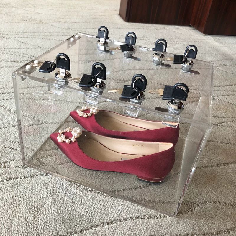 还有一种骚操作是什么?是鞋子光明正大的摆在你面前,但是呢,是带锁的!比如下面这种,盒子上就是 N 把锁,玩一个游戏试一次,直到完美猜对才可以。