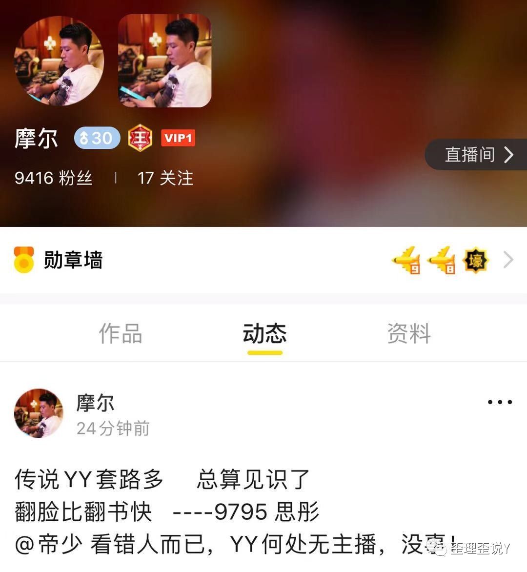 午夜还好好的,今儿上午摩尔就变心了,在动态上嘲讽思彤套路多,原文如下:传说YY套路多,总算见识了。翻脸比翻书快——9795思彤。@帝少,看错人了,YY何处无主播,没事!